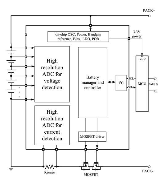 鋰電池組保護(hù)芯片HSM12X0系列包括HSM1220、HSM1230和HSM1240。該系列芯片內(nèi)部集成了高精度ADC可以對(duì)電池組的電壓、電流以及溫度信號(hào)進(jìn)行采集并通過(guò)I2C接口將數(shù)據(jù)傳遞給主機(jī)微控制器。該芯片還具有簡(jiǎn)單的過(guò)壓保護(hù)、欠壓保護(hù)、過(guò)流保護(hù)以及短路保護(hù),支持被動(dòng)均衡。