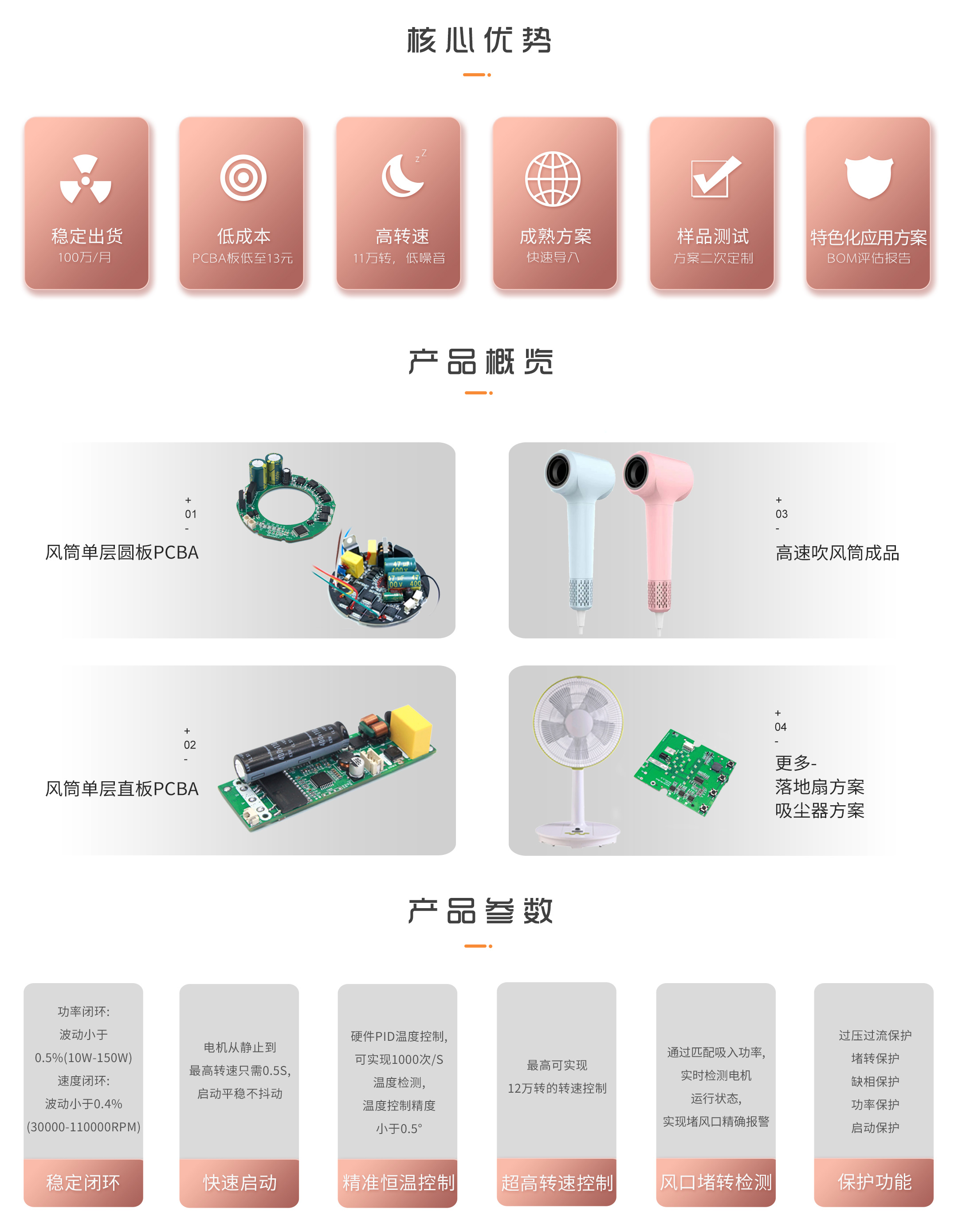 ●啟動迅速、噪聲低、可快速插拔操作 ●支持正弦波FOC無刷電機控制 ●支持多檔風力和多檔溫度控制 ●可過3C、EMC、UL或CE等產(chǎn)品認證 ●提供風道設(shè)計和結(jié)構(gòu)設(shè)計,快速穩(wěn)定加速項目落地 ●批量穩(wěn)定出貨100萬+ |