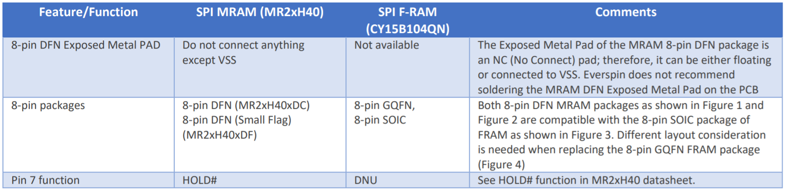 MR2xH40xDF是組織為512Kx8的4Mb非易失性RAM,采用標(biāo)稱(chēng)3.3V電源供電,并且與FRAM兼容。它提供標(biāo)準(zhǔn)的8引腳小標(biāo)志DFN(DF版)和8引腳DFN(DC版),它們是多功能封裝選項(xiàng),可以用SPI-FRAM8引腳SOIC和8引腳GQFN替代它。包(表1)。從硬件的角度來(lái)看,關(guān)鍵的區(qū)別在于用于封裝引腳(引腳7)的PCB的變化。從軟件的角度來(lái)看,這兩個(gè)設(shè)備之間的主要區(qū)別在于引腳7的功能和設(shè)備ID。當(dāng)主機(jī)CPU必須中斷存儲(chǔ)器時(shí),使用MR2xH40xDF的HOLD#引腳(引腳7)另一個(gè)任務(wù)的操作。當(dāng)HOLD#為L(zhǎng)OW時(shí),當(dāng)前操作被掛起。設(shè)備將忽略SCK或CS#上的任何過(guò)渡。當(dāng)SCK為低電平時(shí),必須在HOLD#上進(jìn)行所有轉(zhuǎn)換。如果不使用,此引腳必須連接到VDD。可能需要更改硬件和軟件才能在MRAM上啟用HOLD#功能。