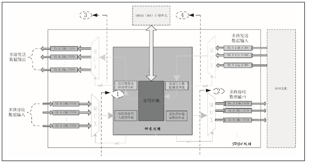 (1)發(fā)送處理部分:邏輯接收HOST主機(jī)的數(shù)據(jù),然后根據(jù)仲裁邏輯的優(yōu)先級策略分通道寫入SDRAM (DDR)中進(jìn)行緩存(寫操作),在發(fā)送的下游數(shù)據(jù)接口,仲裁邏輯再從SDRMA(DDR)中讀取數(shù)據(jù)發(fā)送到相應(yīng)的通道出口中去