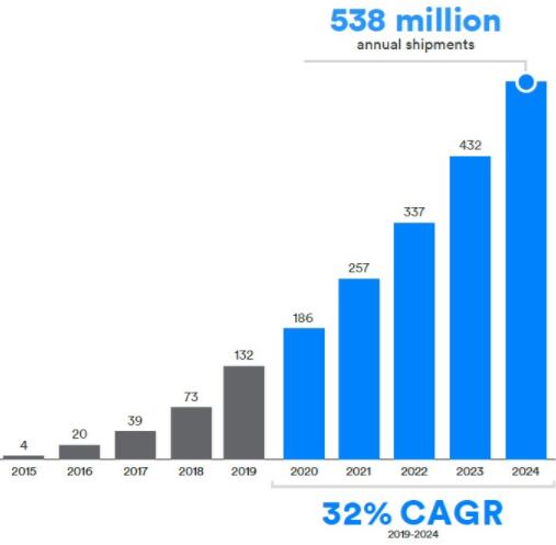 ● 定位服務(wù)應(yīng)用包括:物品標(biāo)簽、倉儲貨物管理、室內(nèi)定位導(dǎo)航、訪問控制等。2019-2024年增長率為32%,到2024年出貨量將達5.38億個。