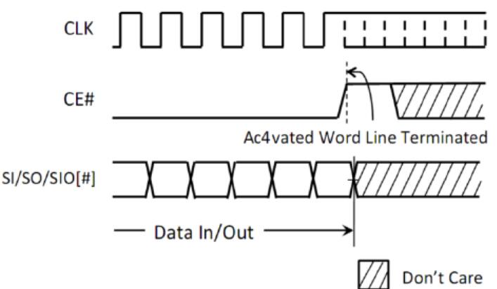 所有所有讀和寫都必須由CE#從低到高完成。CK#的上升沿是終止已激活的讀/寫字線并將設(shè)備設(shè)置為待機(jī)狀態(tài)的觸發(fā)器,否則將阻止內(nèi)部刷新操作,直到設(shè)備看到讀/寫字線已終止,無(wú)需執(zhí)行命令終止操作僅適用于讀取和寫入操作以及任何命令操作,例如Enter Quad模式命令和Reset命令。
