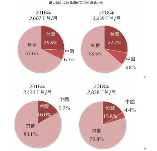 因此2018年中國(guó)企業(yè)規(guī)劃的新增產(chǎn)能目標(biāo)將可能難以實(shí)現(xiàn),預(yù)期下修到7.2萬(wàn)片,其中中國(guó)廠商的先進(jìn)制程(28nm含以下)產(chǎn)能約1.2萬(wàn)片,占新增產(chǎn)能近17%,預(yù)計(jì)2018年中國(guó)自主非存儲(chǔ)器產(chǎn)能將占全球非存儲(chǔ)器產(chǎn)能比重約6.7%。