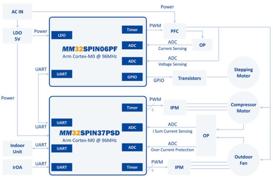MM32SPIN06微控制器的空調(diào)外機(jī)方案如下圖所示,其中MM32SPIN37PSD(2個ArmCortex-M0內(nèi)核,最高主頻96MHz)和MM32SPIN06PF(基于ArmCortex-M0內(nèi)核的高性能32位微控制器,最高工作頻率可達(dá)96MHz)為主控制器。