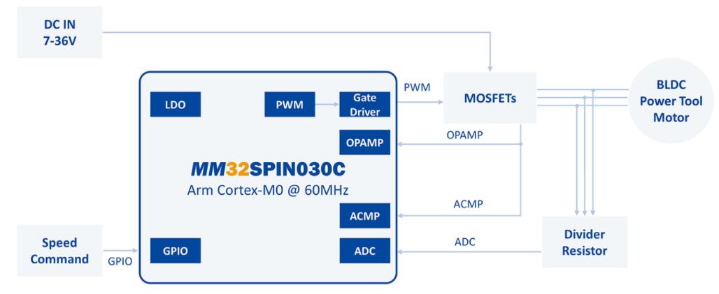 MM32SPIN030C,Arm® Cortex-M0內(nèi)核,最高工作頻率可達60MHz,內(nèi)置存儲器32KB Flash和4KB SRAM,具有1 路 12 位模數(shù)轉換器 ADC,支持 11 通道,采樣速率 1Msps,4 個通用定時器,1 個針對電機控制的 PWM 高級定時器,支持 UART/SPI 通信,針對電機應用內(nèi)置 2 個運放、2 個比較器,內(nèi)置三相 P/N 柵極驅動器。