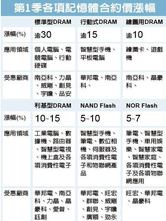 今年存儲芯片缺貨效應(yīng)持續(xù)擴大,繼DRAM、儲存型快閃存儲(NAND Flash)在淡季飆出歷年最大漲幅后,編碼型快閃存儲(NOR Flash)也在睽違四年多來初次提價,第一季度調(diào)漲5~7%不等,下季漲幅更大,估計漲幅逾10%。