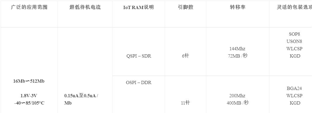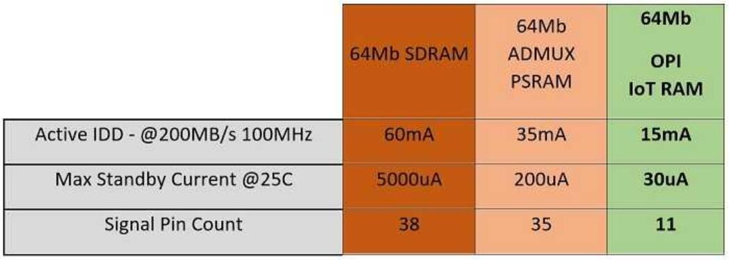 ram替換DRAM,消除了對(duì)外部刷新控制器的需求,這降低了接口的復(fù)雜性和相關(guān)的驗(yàn)證成本,利用了外部SPI接口的使用,同時(shí)保持了最新IoT應(yīng)用程序所要求的高性能水平,并降低整個(gè)系統(tǒng)的功耗。有些基于MCU的舊系統(tǒng)仍在使用SDRAM,在降低功耗和簡化接口方面,可以受益于IoT RAM的使用。下表清楚顯示了待機(jī)電流和有功電流的優(yōu)點(diǎn),同時(shí)保持了相當(dāng)?shù)膫鬏斔俾省?/div>
