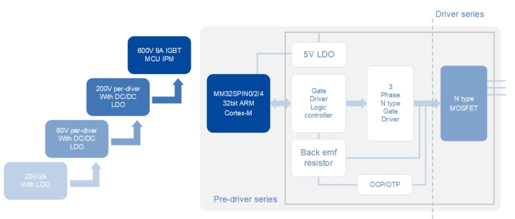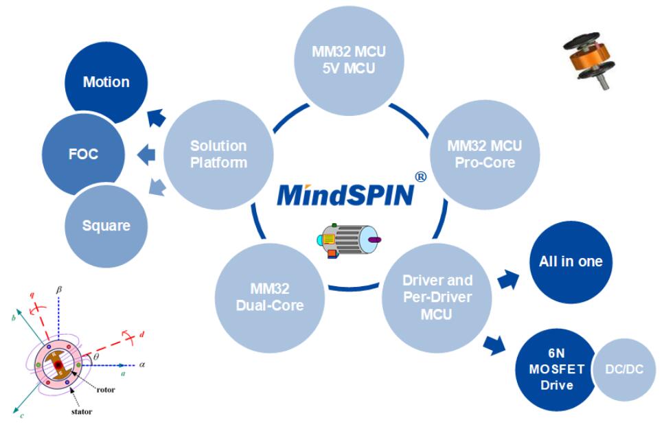 SPIN是旋轉(zhuǎn)的同義詞,再注入靈動(dòng)微電子的靈魂Mind,表示靈活與專業(yè)。包含了三大主軸:專業(yè)MCU,專用驅(qū)動(dòng)MCU微控制器及解決方案平臺(tái)。專用MCU的獨(dú)特之處是帶領(lǐng)了許多主流應(yīng)用,如:電動(dòng)車的應(yīng)用,目前市場的占有率仍然保持領(lǐng)先地位;專用驅(qū)動(dòng)型MCU微控制器電壓范圍從20V至600V。例:MM32SPIN222C集成了三相MOSFET、預(yù)驅(qū)以及LDO,可讓小空間發(fā)揮最大的功能,同時(shí)內(nèi)建了高性能32位的Arm Cortex-M0內(nèi)核為運(yùn)算核心,讓開發(fā)更為簡單快捷;解決方案平臺(tái)由擁有超過10年以上算法開發(fā)經(jīng)驗(yàn)的MindSPIN團(tuán)隊(duì)精心打造,按技術(shù)方式分為方波、旋波FOC以及位置控制三類,按應(yīng)用方式可分為風(fēng)機(jī)、電動(dòng)工具、微電機(jī)、家電以及電動(dòng)車五大類,同時(shí)靈動(dòng)微電子還提供了不同的相對(duì)應(yīng)的特色