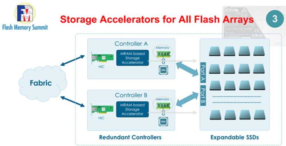 在全閃存陣列的存儲(chǔ)控制器中,MRAM可以作為緩存加速,并提升產(chǎn)品性能及可靠性,同時(shí)可以不需要額外的電池或者電容。