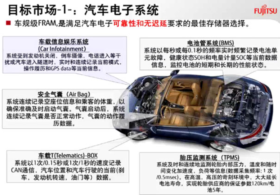 富士通FRAM早已能適用如汽車安全氣囊數(shù)據(jù)信息存儲(Airbag)、安全事故數(shù)據(jù)信息記錄軟件(EDR)、充電電池智能管理系統(tǒng)(BMS)、新能源汽車全車自動控制系統(tǒng)(VCU),新能源汽車CAN小盒子(CAN-BOX)、新能源汽車載終端設(shè)備(T-BOX)、胎壓監(jiān)測裝置(TPMS)、車輛駕駛輔助系統(tǒng)軟件(ADAS)及導(dǎo)航欄與信息內(nèi)容車載多媒體(infotainment)等運用中的即時且不斷的數(shù)據(jù)信息存儲,所以能減少系統(tǒng)軟件復(fù)雜性并提升數(shù)據(jù)庫安全,。