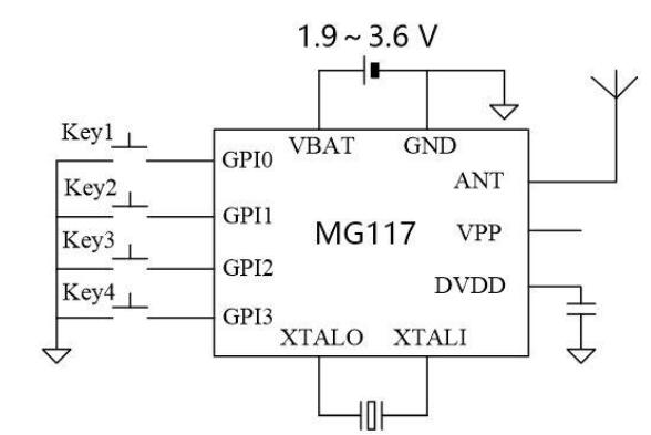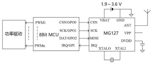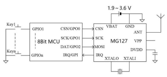 藍牙芯片MG127是具有低功耗、低成本的BLE 收發(fā)器,內(nèi)部集成了發(fā)射機、接收機、GFSK 調(diào)制解調(diào)器和BLE 基帶處理。電源電壓1.9~3.6,可以采用一個紐扣電池(3.0v)供電,具備3uA待機電流,20mA@0dBm持續(xù)發(fā)射,18mA持續(xù)接收等特點。MG127 采用DFN3x3 封裝,只需搭配低成本MCU 和少數(shù)外圍被動器件,即可實現(xiàn)BLE 遙控、藍牙電子秤等應(yīng)用。