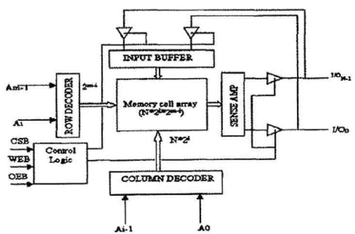 由上圖看出SRAM一般由五大部分組成,即存儲單元陣列、地址譯碼器(包括行譯碼器和列譯碼器)、靈敏放火器、控制電路和緩沖/驅動電路。在圖中A0-Am-1為地址輸入端,CSB. WEB和OEB為控制端,控制讀寫操作,為低電平有效1100-11ON-1為數(shù)據(jù)輸入輸出端。存儲陣列中的每個存儲單元都與其它單元在行和列上共享電學連接,其中水平方向的連線稱為“字線”,而垂直方向的數(shù)據(jù)流入和流出存儲單元的連線稱為“位線”。