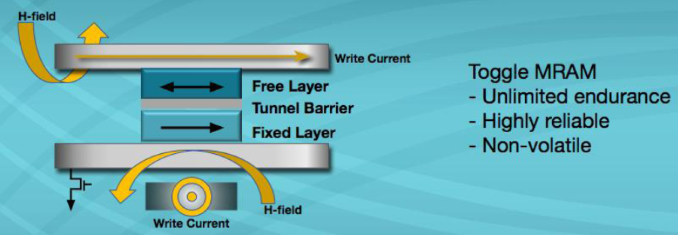 MRAM或磁性隨機(jī)存取存儲器使用具有鐵磁性材料的磁性“狀態(tài)”的1晶體管–1磁性隧道結(jié)(1T-1MTJ)體系結(jié)構(gòu)作為數(shù)據(jù)存儲元素。由于MRAM使用磁性狀態(tài)進(jìn)行存儲(而不是隨時間推移而“泄漏”的電荷),因此MRAM提供了相當(dāng)長的數(shù)據(jù)保留時間(+20年)和無限的耐用性。切換磁極化(寫入周期)是在電磁隧道結(jié)(MTJ)上方和下方的導(dǎo)線中產(chǎn)生脈沖電流的結(jié)果(見圖1)。電流脈沖產(chǎn)生的相關(guān)H場改變了鐵磁材料自由層的極化,這種磁開關(guān)不需要原子或電子的位移,這意味著沒有與MRAM相關(guān)的磨損機(jī)制。自由層相對于固定層的磁矩改變了MTJ的阻抗(見圖2)。阻抗的這種變化表示數(shù)據(jù)的狀態(tài)(“1”或“0”)。通過測量MTJ的阻抗來實現(xiàn)傳感(讀取周期)(圖3)。MRAM器件中的讀取周期是非破壞性的,并且相對較快(35ns)。讀取操作是通過在MTJ兩端施加非常低的電壓來完成的,從而在部件壽命內(nèi)支持無限的操作。