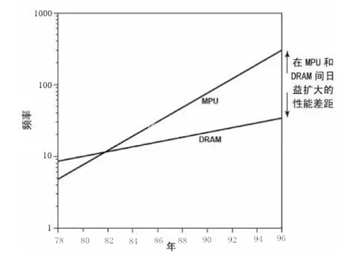 芯片集成度的不斷提升,給分立存儲器帶來了兩大挑戰(zhàn):首先:集成度和工藝開始允許片內集成更多的存儲器;其次,存儲器的速度發(fā)展遠遠趕不上于MPU的速度,MPU速度以每年60%在成長,而存儲器只有10%。二者速度之間增長的差異巨大,如下圖所示。