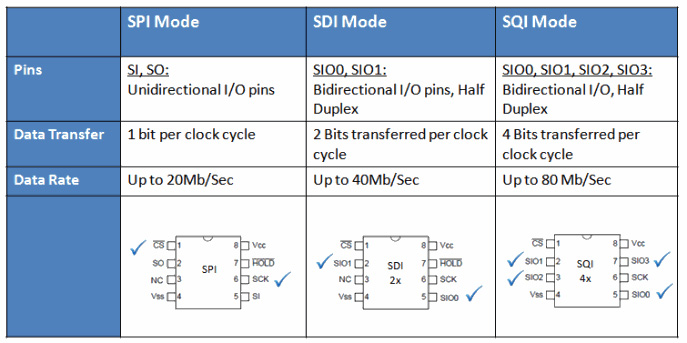 SQI模式下,全部4個(gè)引腳(引腳2、4、5和7)均配置為可隨時(shí)高效進(jìn)行讀或?qū)懖僮鳎_保在一個(gè)時(shí)鐘周期內(nèi)通過總線傳輸4位,這實(shí)際上會(huì)獲得4倍數(shù)據(jù)速率。例如,標(biāo)準(zhǔn)SPI模式下需花費(fèi)40個(gè)時(shí)鐘周期才能完成的任務(wù)現(xiàn)在可以在40/4 = 10個(gè)時(shí)鐘周期內(nèi)完成。 需要快速傳輸大量數(shù)據(jù)時(shí),該功能十分有用。